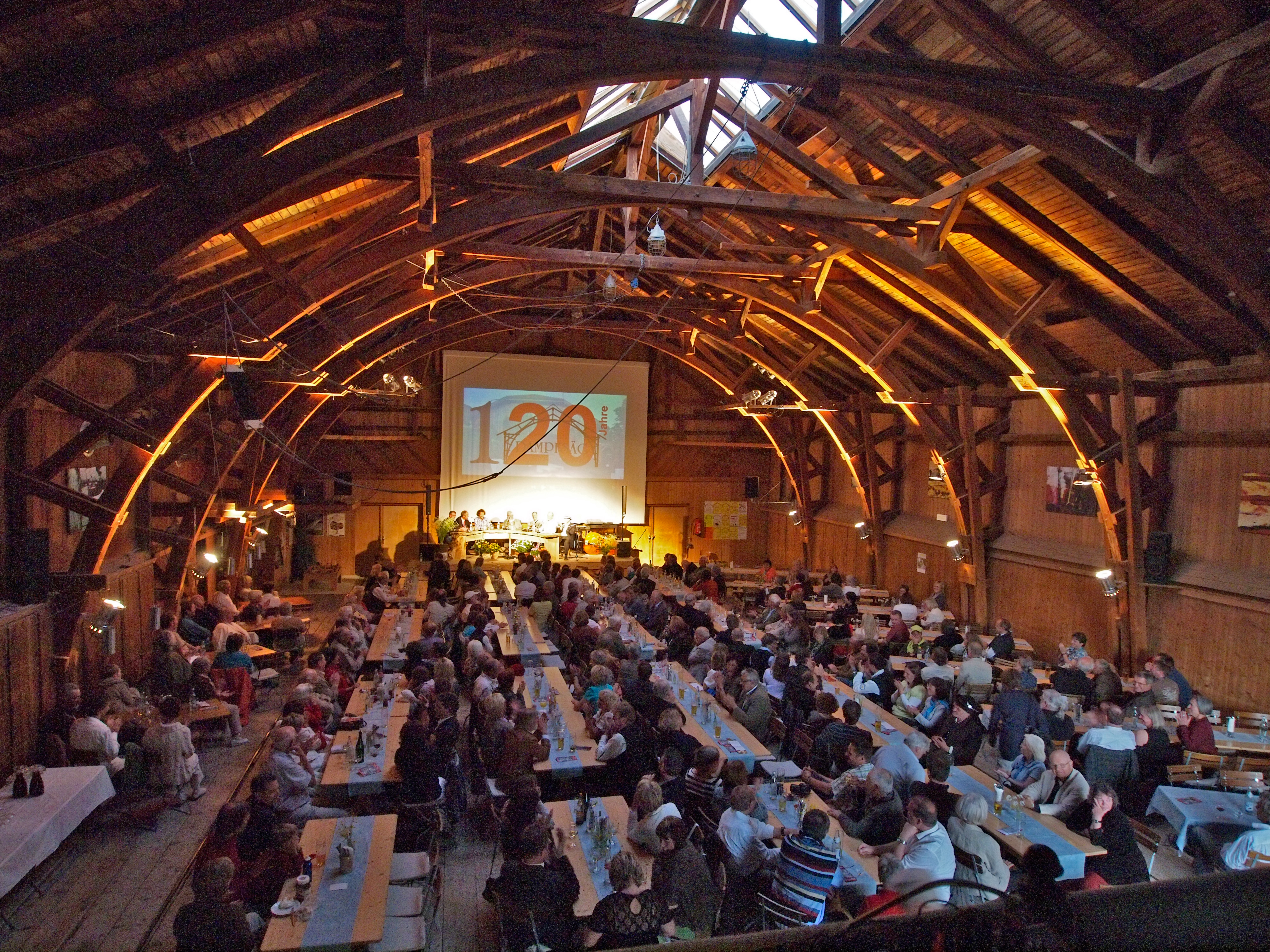 Unsere Rundbogenhalle bietet ein gemütliches und exklusives Ambiente für ihre Feiern von 80 bis 300 Personen. Die beeindruckende Holzbauweise und die hohe Firsthöhe von 9,5 m sorgen für eine ausgezeichnete Akustik und eine gute Luftzirkulation. Bei Sonnenschein und warmen Temperaturen kann das große Tor der Sägehalle geöffnet werden – somit sitzt man fast im Freien. Das 3.500 m² große Freigelände eröffnet darüber hinaus viele Möglichkeiten für Präsentationen und Gespräche.